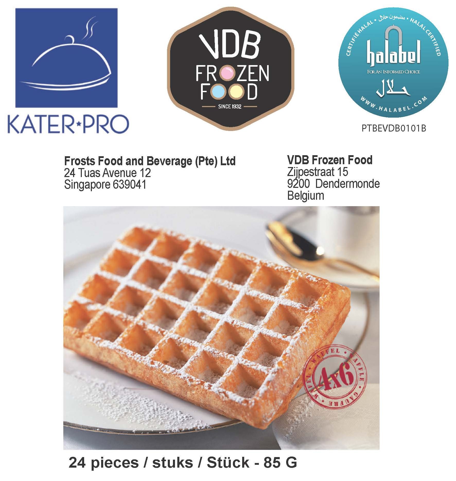 The product "Frozen Brussels Waffle", manufactured by Deligout (in Mouscron in Belgium), halal certified by HALABEL is marketed by VDB FROZEN FOOD PRODUCTION under different brands, around the world, like VDB, KaterPro...