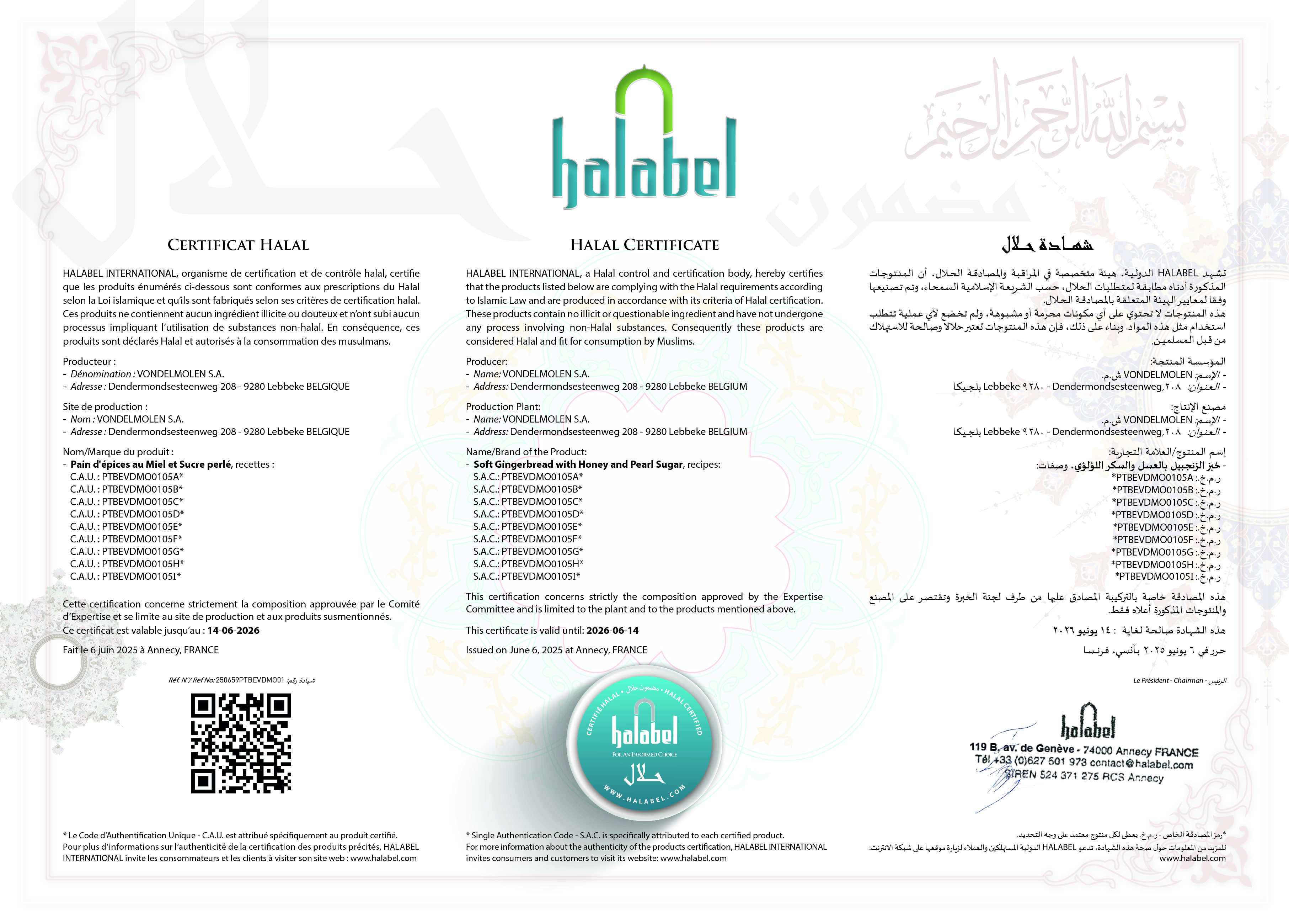 Certificat associé à "VONDELMOLEN S.A.", délivré par HALABEL INTERNATIONAL, valide jusqu’au 14-06-2026 :