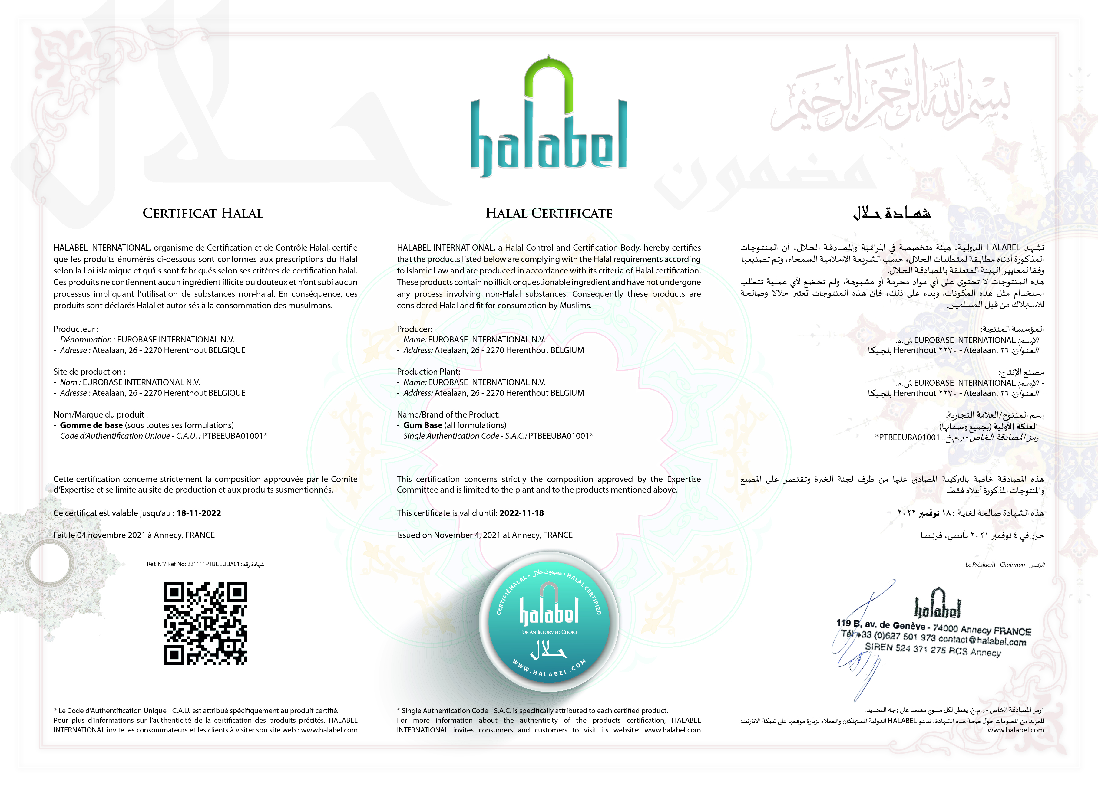 - Gomme de base sous toutes ses formulations émises par EUROBASE INTERNATIONAL SA - CAU : PTBEEUBA01001, exclusivement sur la base de la composition validée par le Comité d’Expertise d’HALABEL.