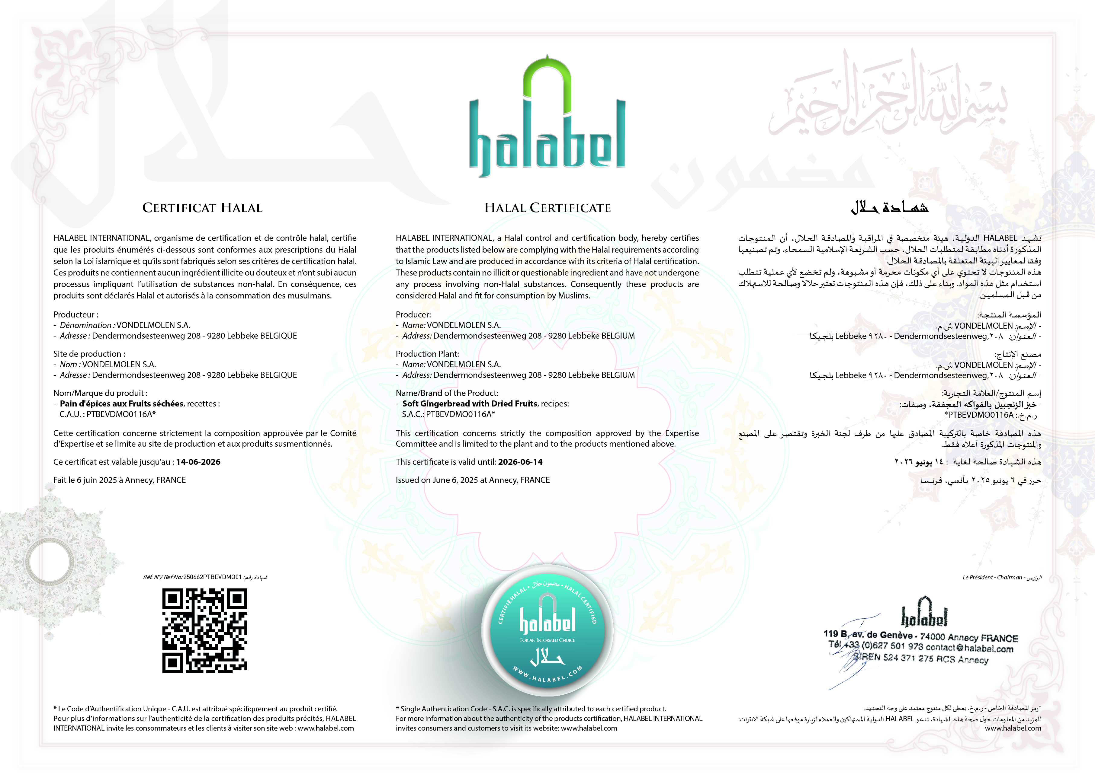 Certificat associé à "VONDELMOLEN S.A.", délivré par HALABEL INTERNATIONAL, valide jusqu’au 14-06-2026 :